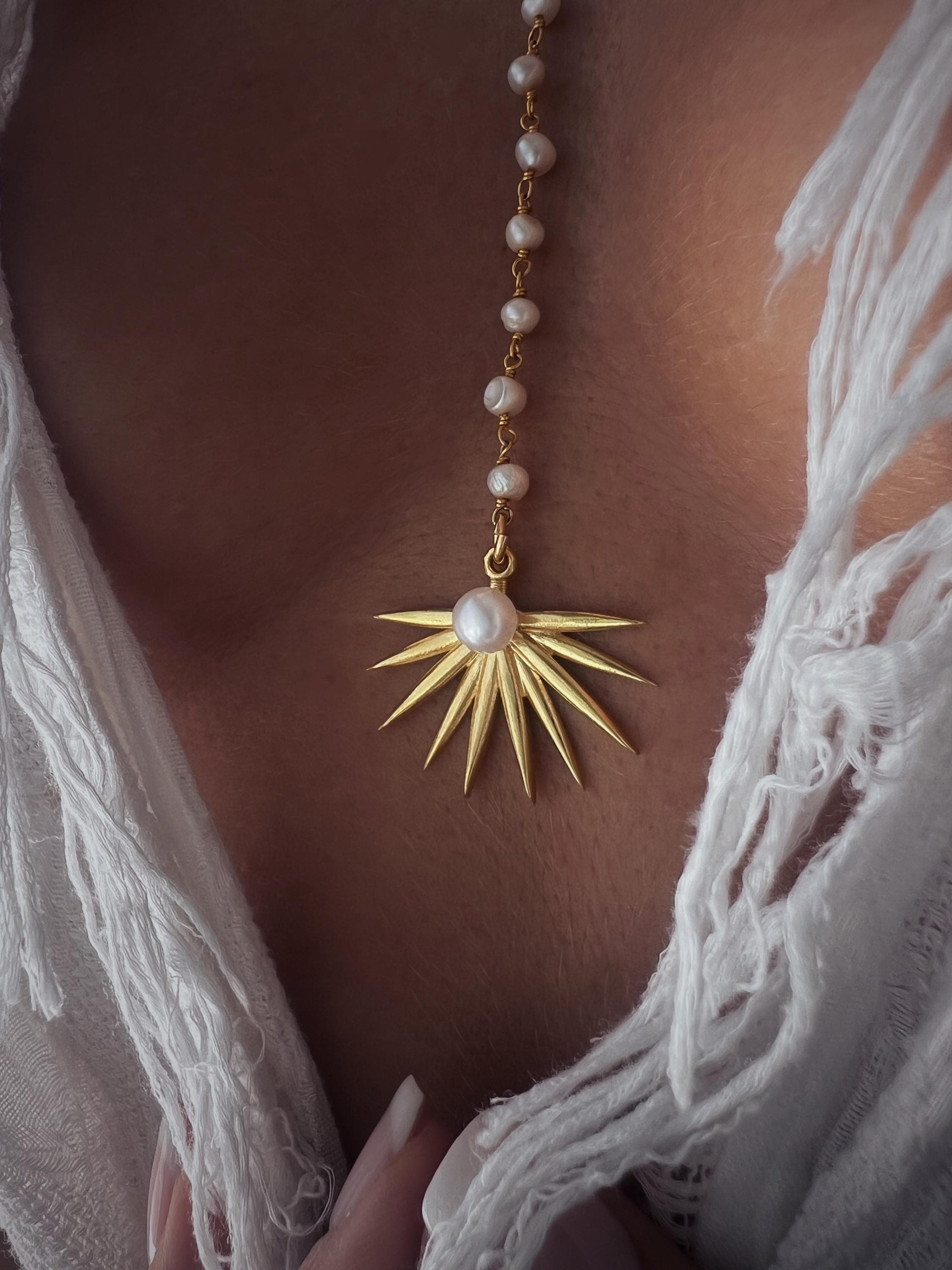 A natural pearl adorne a gold palm tree leaf and rest on gold chain or on Rosario with pearls .