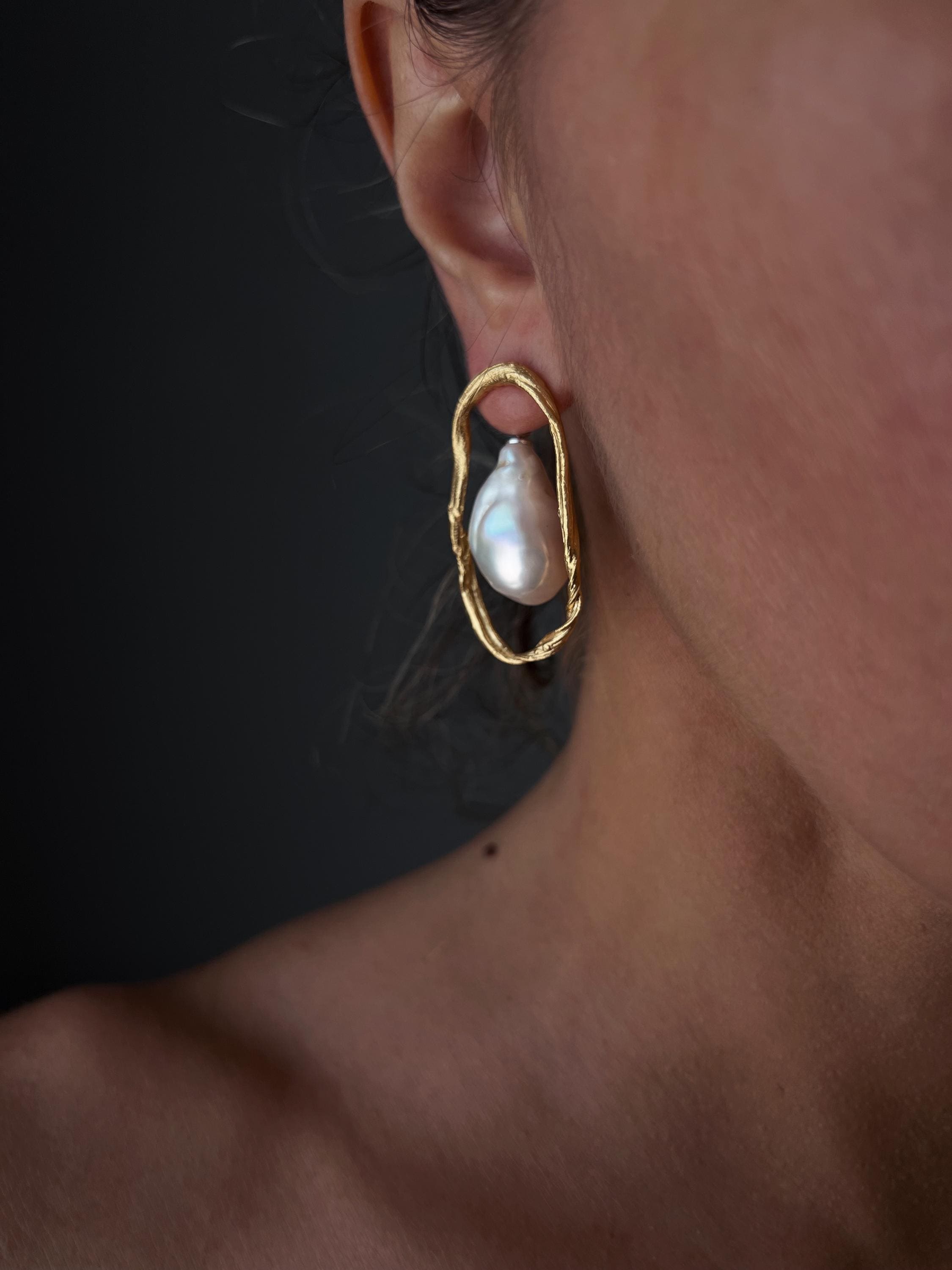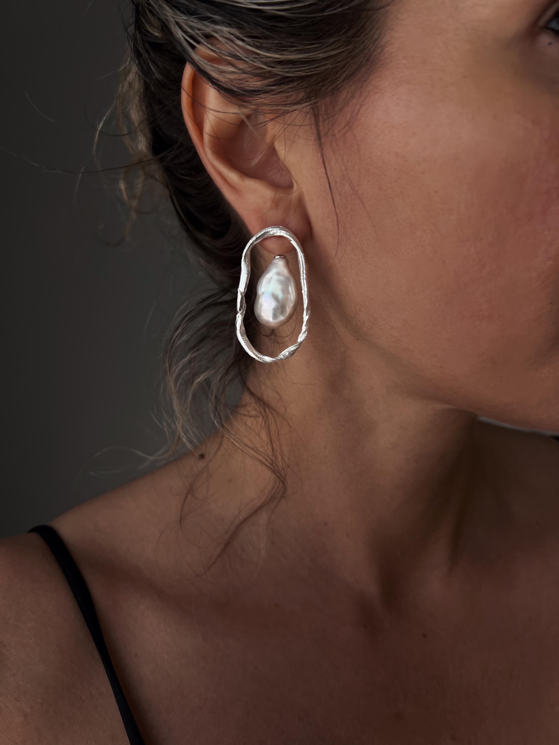 Available in Sterling Silver or 18k Gold Vermeil or rose gold filled or black rhodium filled with a baroque freshwater pearl drop. All pearls are one-of-a kind and may differ slightly from these photos.