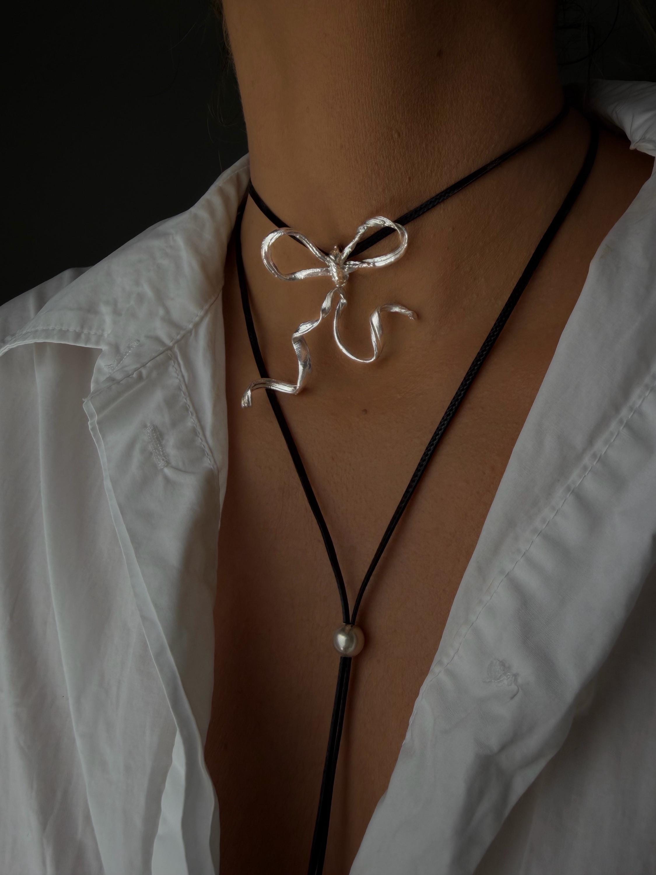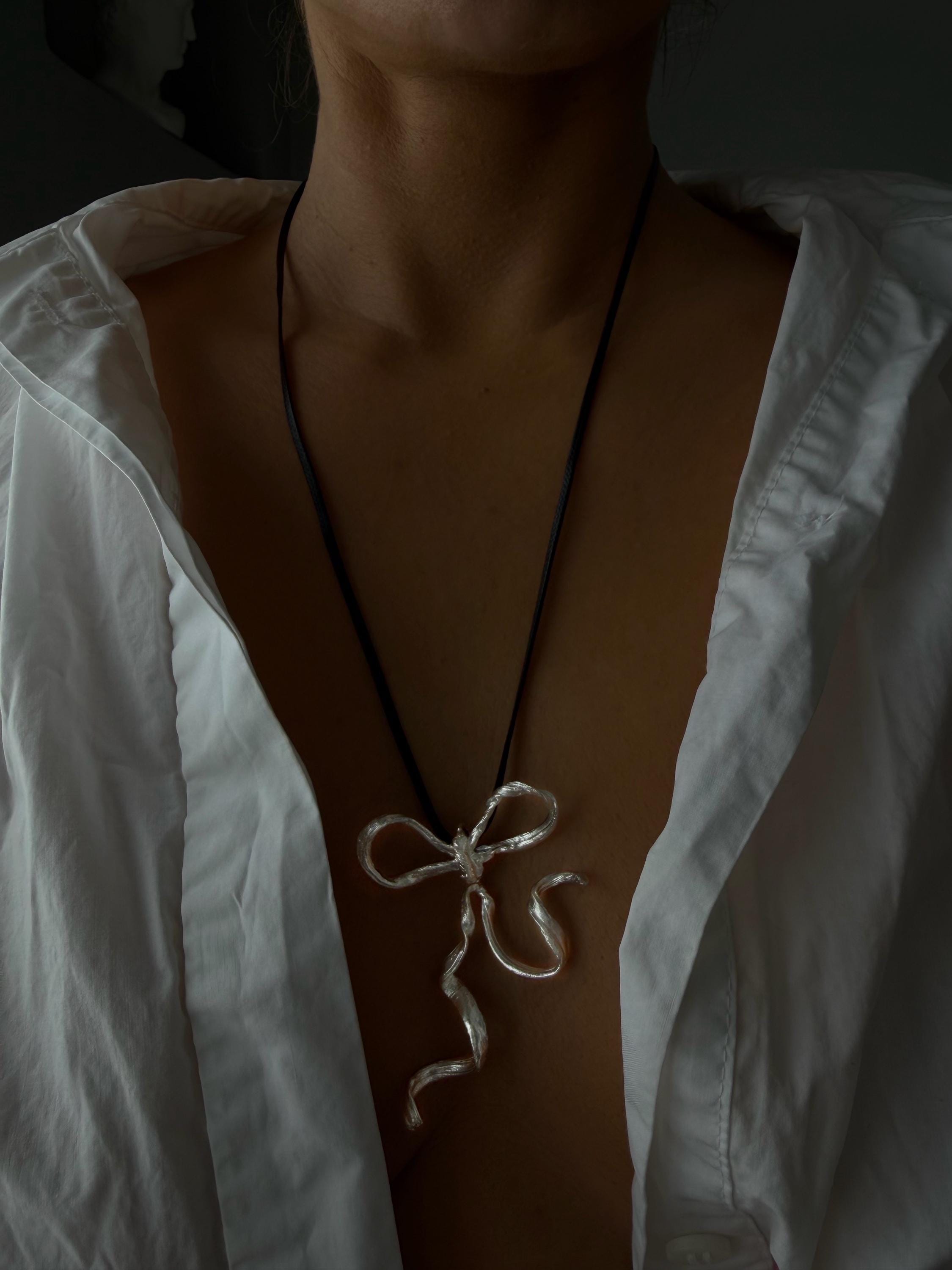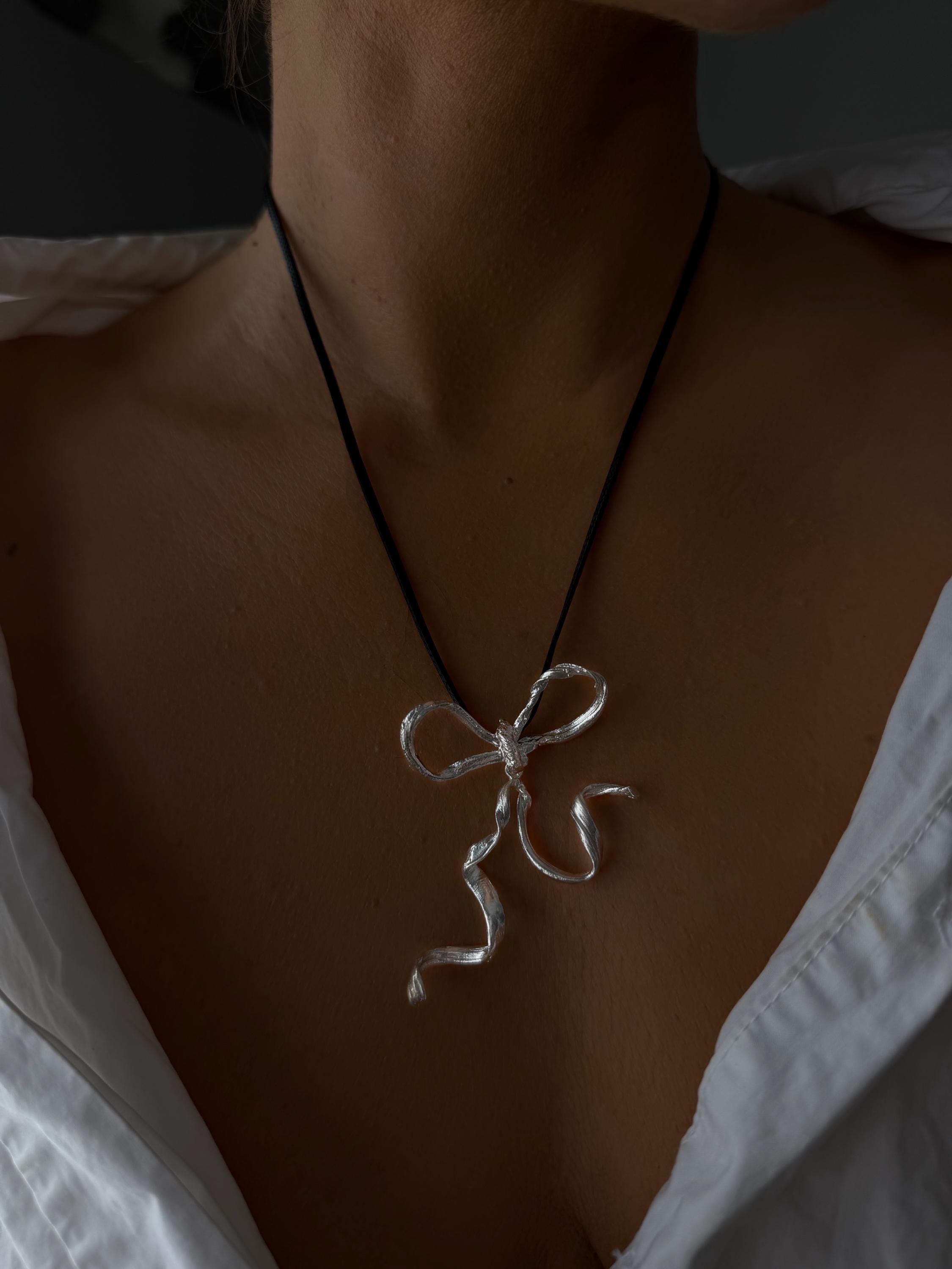 Embrace the ultimate "Coquette" staple with this stunning ribbon necklace. Featuring a sleek, sculptural bow pendant with a fluid, melting silhouette, this piece reimagines classic femininity through a modern, edgy lens.