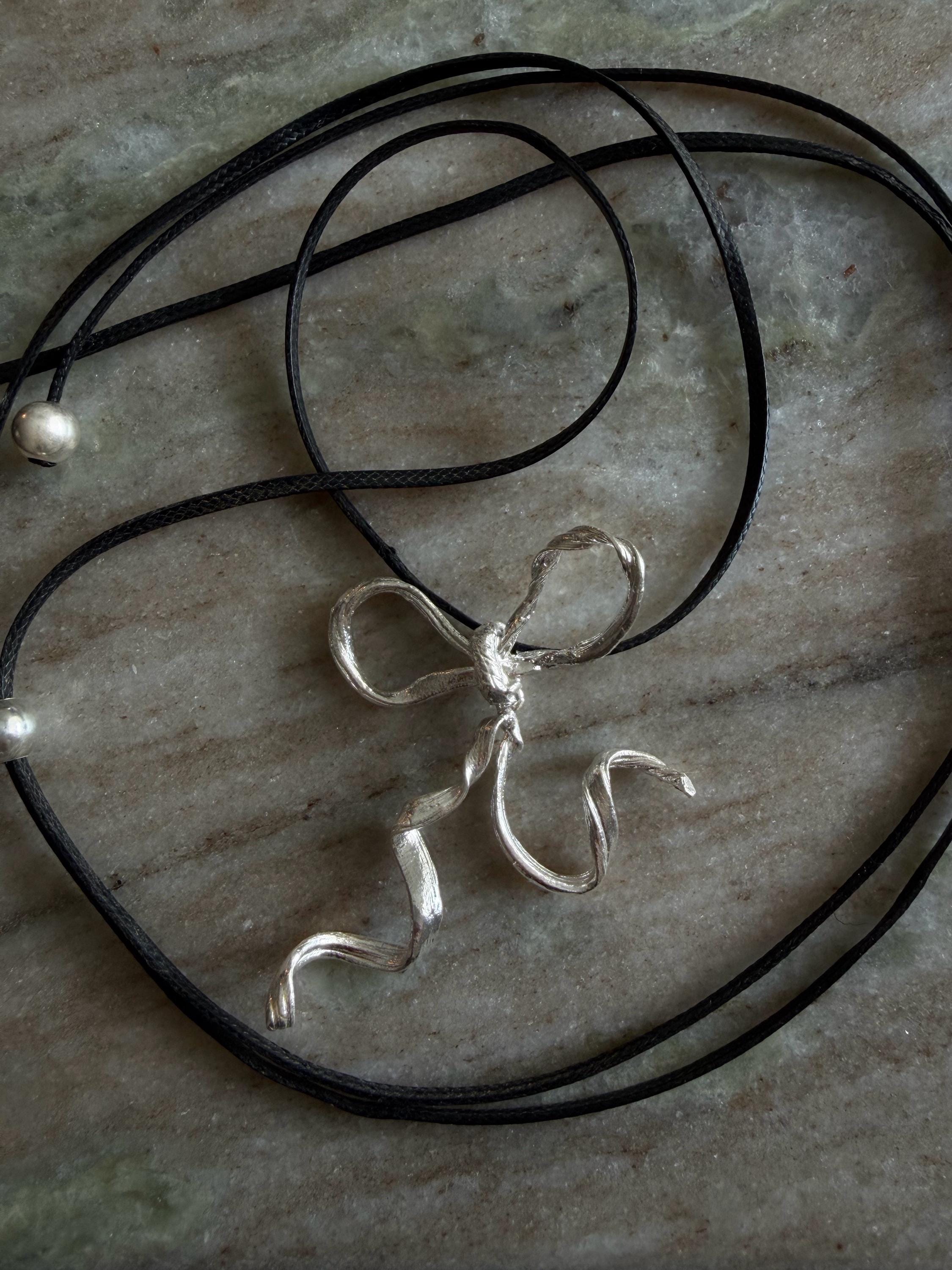 Silver bow on black cord.