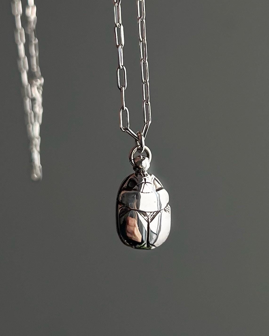 A handmade solid sterling silver pendant hand crafted scarab beetle rests on a chain 47cm